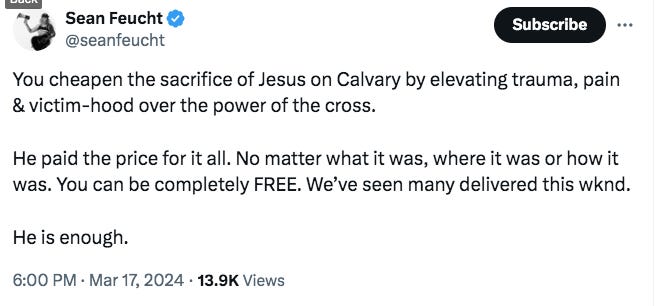 One hears such language in evangelical circles: a combination of vague accusation and unwarranted triumphalism. The point of Feucht’s tweet is that by elevating their trauma over the power of the cross, suffering people are choosing not to be completely free. The accusation is meaningless, of course, people suffering emotionally aren’t “elevating trauma, pain and victim-hood” any more than the man with the broken leg is.